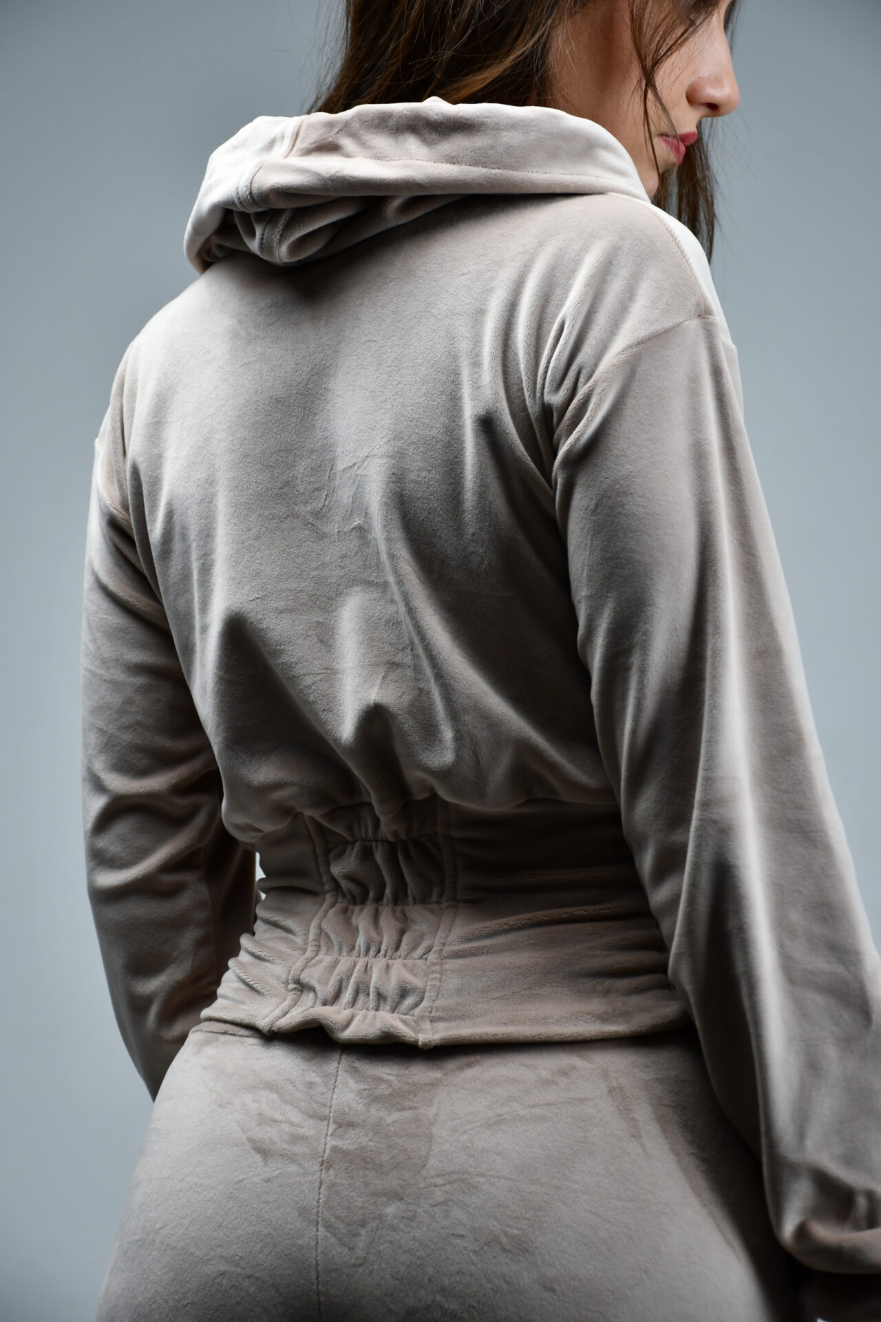 W skład kompletu wchodzi krótsza, taliowana bluza z kapturem oraz dopasowane spodnie z elastyczną gumką w pasie. Krój pięknie podkreśla sylwetkę, a przylegające do ciała spodnie modelują figurę i zapewniają wygodę noszenia. Miękki, gładki welur jest niezwykle przyjemny w dotyku i nadaje całości eleganckiego, lekko luksusowego charakteru.